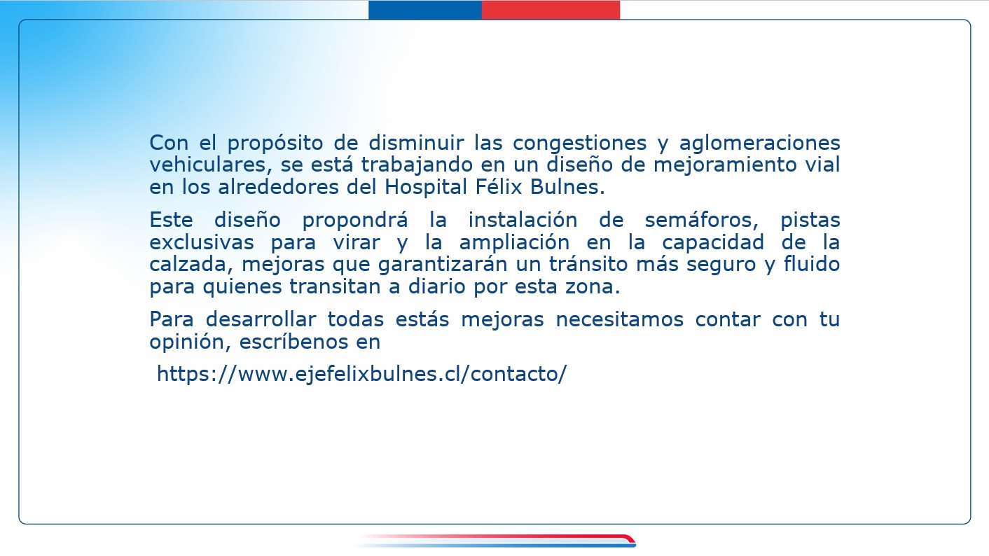Con la puesta en marcha del nuevo Hospital Félix Bulnes aumentó la demanda de los modos de desplazamientos, volviéndose imperativo aumentar la capacidad vial de la zona y responder así a las necesidades de los usuarios y usuarias del centro de salud y sus alrededores. El mejoramiento vial busca facilitar el desplazamiento que realizan quienes transitan en torno al centro hospitalario de la comuna de Cerro Navia.